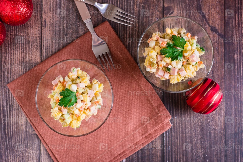 Русский салат оливье из колбасы и вареных овощей в мисках на деревянном столе. Вид сверху