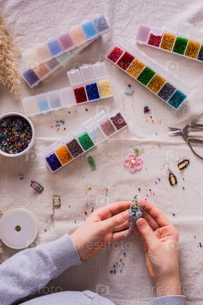 Детские руки держат попугая из бисера на рабочем месте. Верхний и вертикальный вид