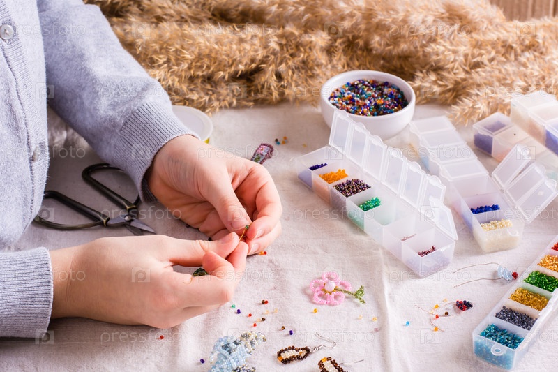Девушка плетет браслет из бисера на столе среди коробочек с бисером. Детское хобби