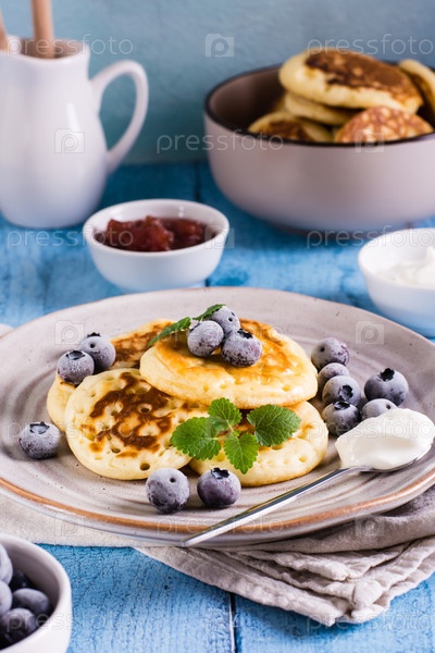 Блинчики с черникой, сметаной и мятой на тарелке на столе. Домашняя выпечка. Вертикальный