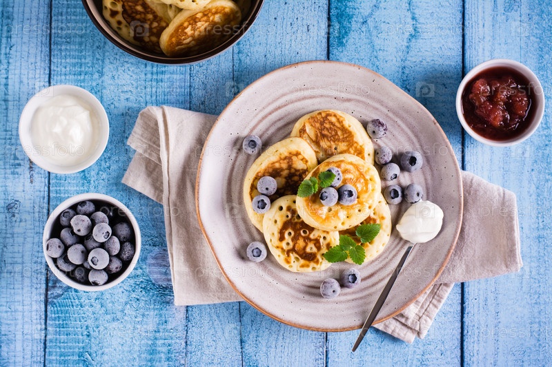 Блинчики с черникой, сметаной и мятой на тарелке на столе. Домашняя выпечка. Вид сверху