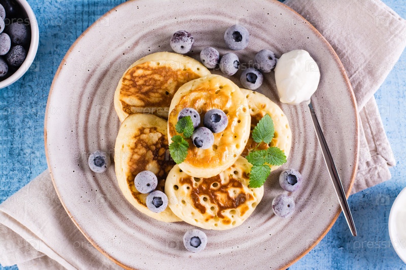 Блинчики с черникой, сметаной и мятой на тарелке. Домашняя выпечка. Вид сверху. Крупный план
