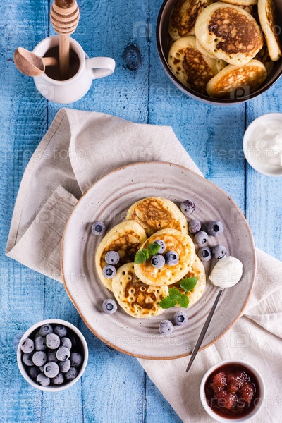 Тарелка блинчиков с черникой, сметаной и мятой. Домашняя выпечка. Верхний и вертикальный вид