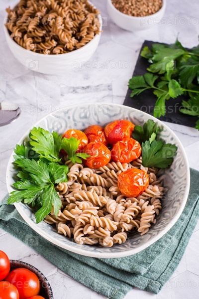 Отварная гречневая паста, помидоры и петрушка в миске на столе. Альтернативная диета. Вертикальный вид