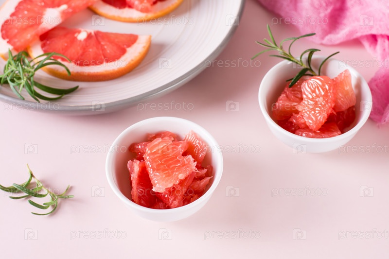 Сочные ломтики грейпфрута и розмарин в миске на столе. Состав коктейля