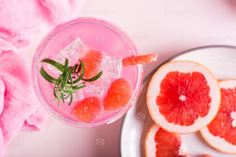 Розовый коктейль с розмарином в стаканах на столе. Концепция розовой еды. Вид сверху. Крупный план