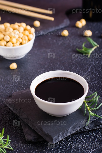 Соевый соус в миске и соевые бобы на столе. Вертикальный вид