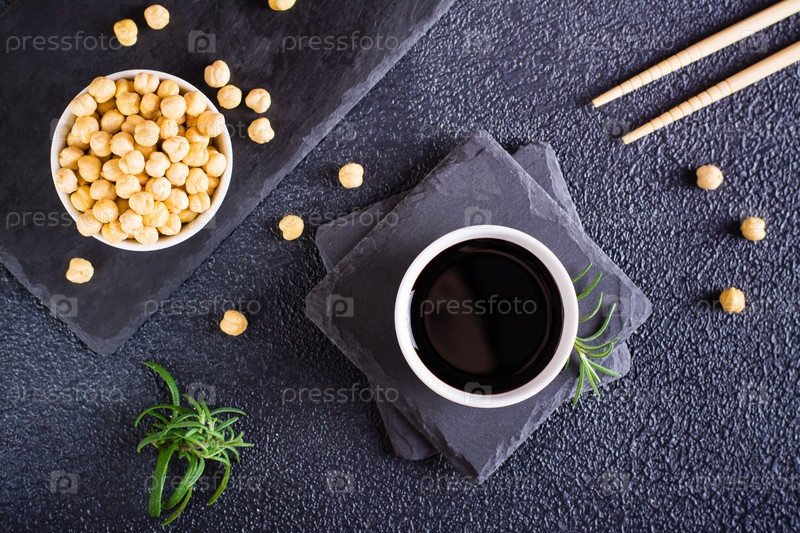 Соевый соус в миске и соевые бобы на столе. Вид сверху