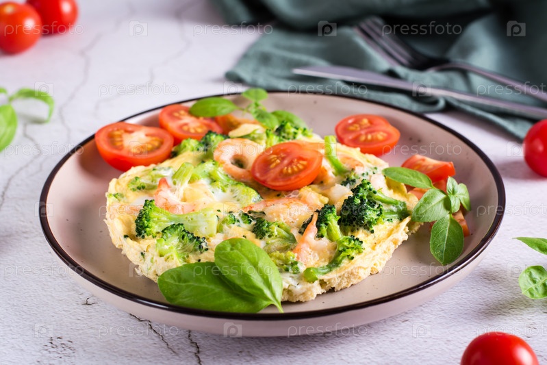 Омлет с брокколи и креветками на тарелке на столе. Белковая еда домашнего приготовления