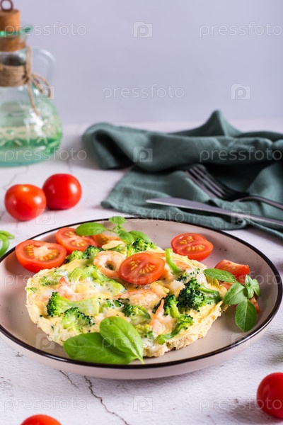 Омлет с брокколи и креветками на тарелке на столе. Домашняя белковая еда. Вертикальный вид