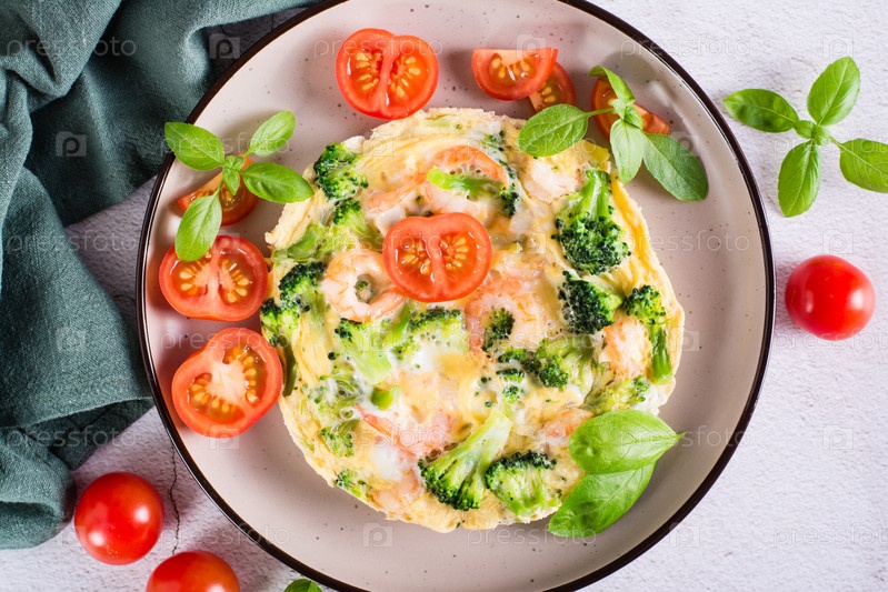 Омлет с брокколи и креветками на тарелке на столе. Домашняя белковая еда. Вид сверху. Крупный план