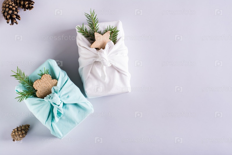 Два фурошики с еловыми ветками и сосновыми шишками на светлом фоне. Экологичные подарки