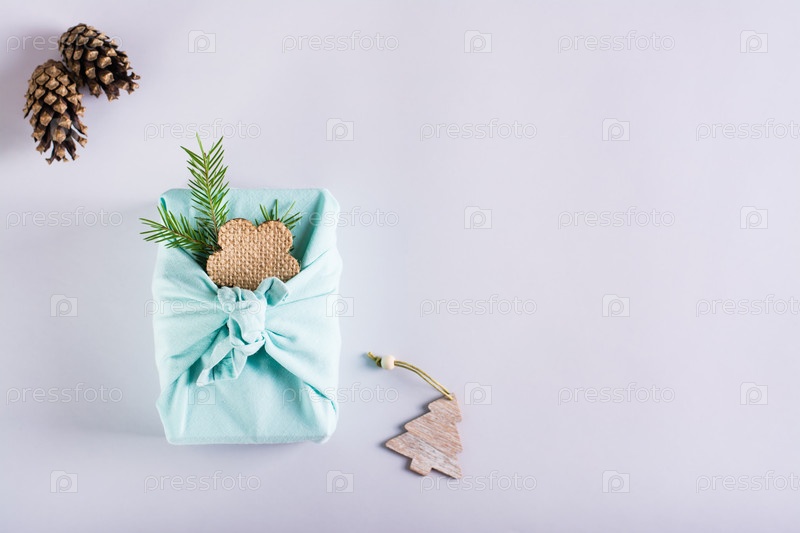 Фуросик с еловыми ветками, деревянными украшениями и шишками на светлой бумаге. Экологичные подарки