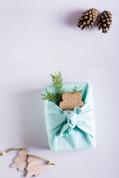 Фуросик с еловыми ветками, деревянными украшениями и шишками на светлой бумаге. Вертикальный вид