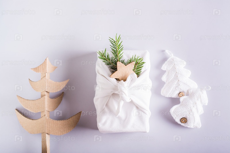 Фурошик с еловыми ветками, картонной елью и вязаными елочками на светлом фоне