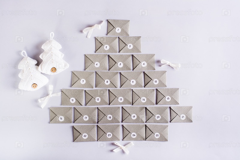 Конверты для адвент-календаря в виде елки и вязаных елок на сером