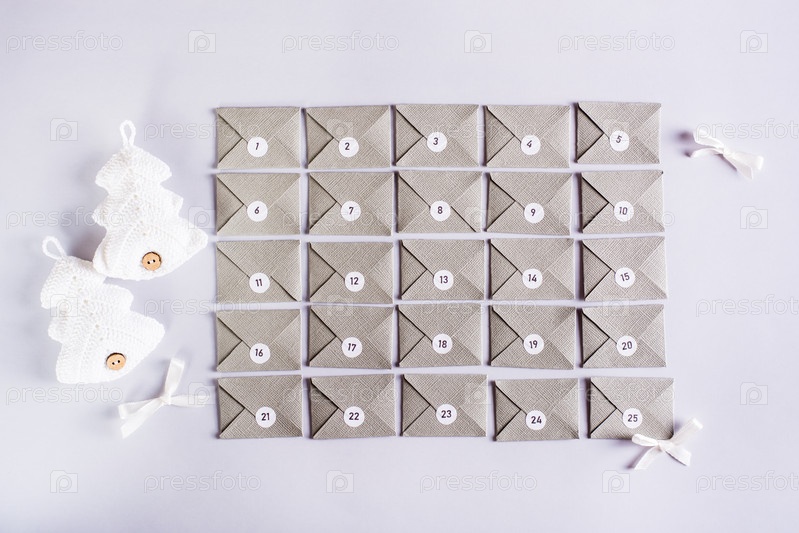 Конверты для адвент-календаря в прямоугольнике и вязаные елки на сером фоне