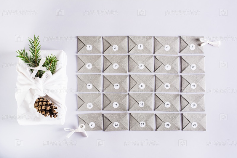 Конверты для адвент-календаря и фурошик с еловыми ветками на сером фоне
