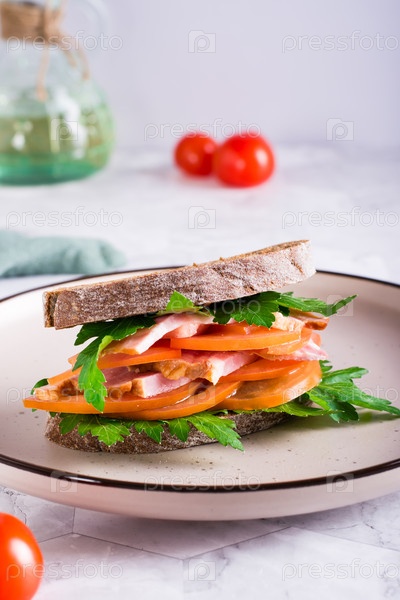 Сэндвич из ржаной чиабатты, ветчины, помидоров и петрушки на тарелке на столе. Вертикальный вид