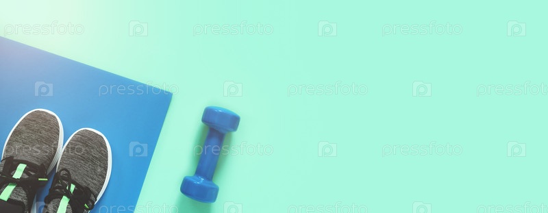 Серые кроссовки и синяя гантель на синем и бирюзовом фоне баннера. Концепция спорта