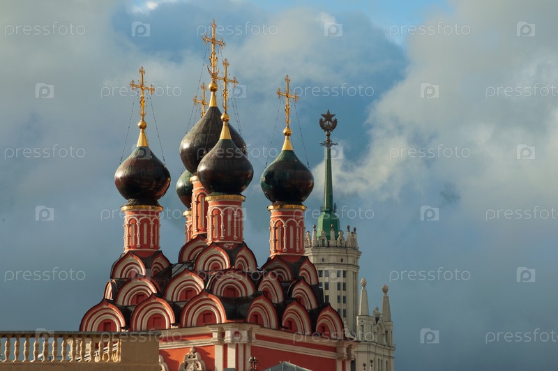 Церковные купола и шпиль высотного здания, Москва