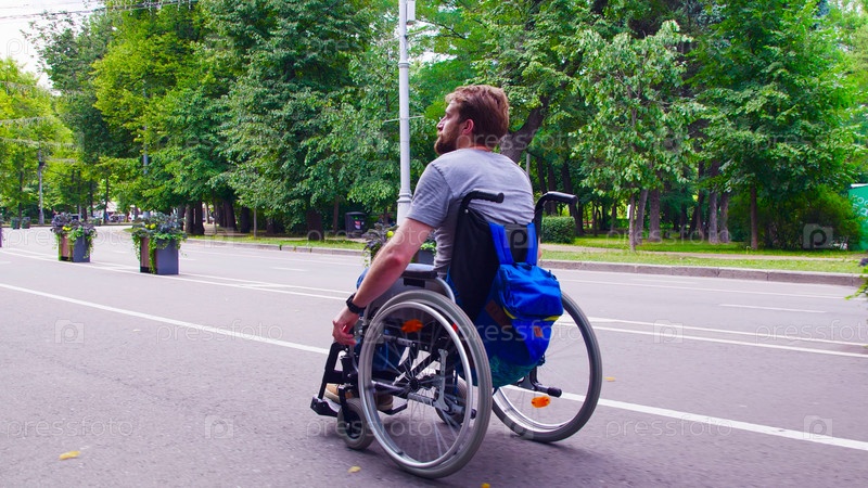 Молодой инвалид гуляет по парку в инвалидной коляске