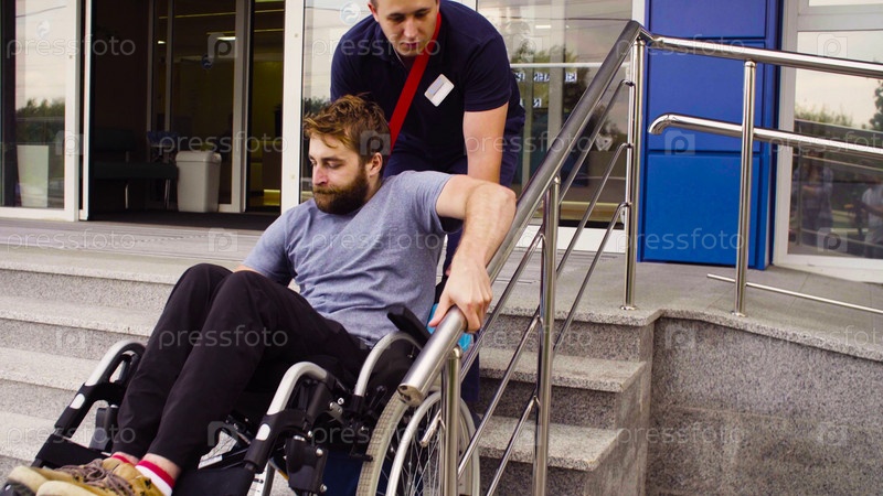 Мужчина помогает спуститься по лестнице инвалиду в инвалидной коляске
