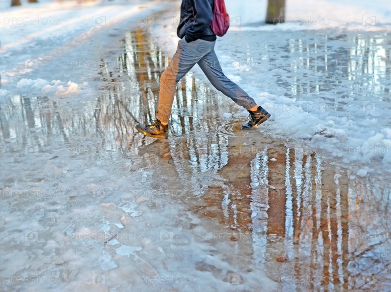 Ноги молодого человека, прогуливающегося по парку ранней весной