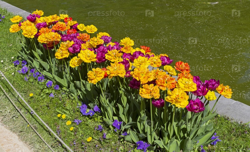 Красивые желтые и фиолетово-красные махровые тюльпаны на клумбе. Солнечный день в мае. Аптекарский Огород (филиал ботанического сада МГУ), Москва