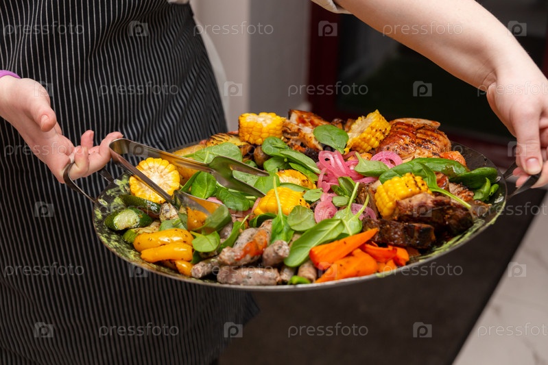 Официант принес мясное и овощное ассорти, обжаренное на воке