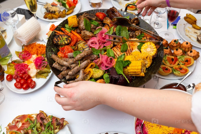 Официант принес мясное и овощное ассорти, обжаренное на воке