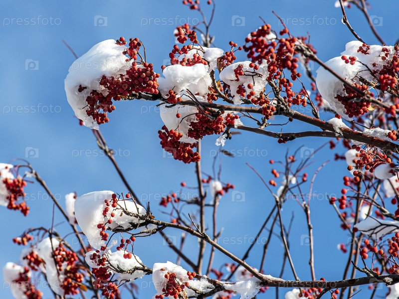Ярко-красные ягоды рябины на ветвях, покрытых снегом зимой