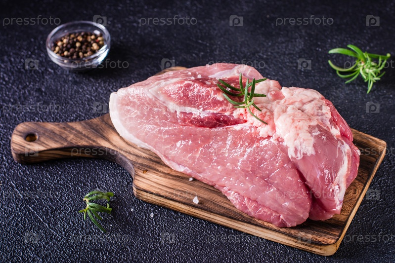 Большой кусок свинины, розмарин и соль на разделочной доске на черном фоне
