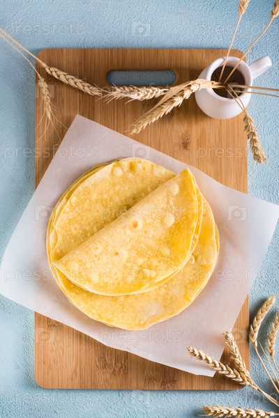 Стопка плоских мексиканских кукурузных лепешек на деревянной доске на столе. Верхний и вертикальный вид