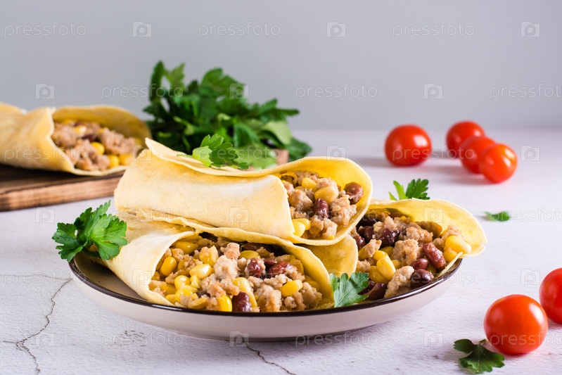 Буррито с фаршем, кукурузой, фасолью и помидорами в кукурузных лепешках на тарелке на столе