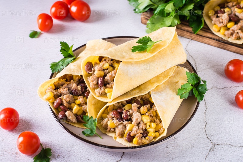 Традиционные мексиканские буррито с мясным фаршем, кукурузой и фасолью на тарелке на столе
