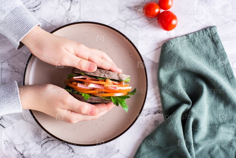 Сэндвич из ржаной чиабатты, ветчины, помидоров и петрушки в руках на тарелке на столе. Вид сверху