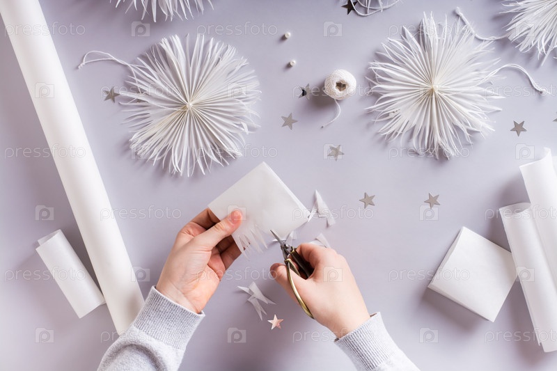 Детские ручки ножницами вырезают из бумаги новогоднюю снежинку. Декор ручной работы