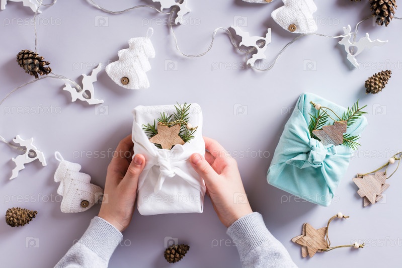 Детские руки держат фурошик на столе с рождественским декором. Экологичные подарки. Вид сверху
