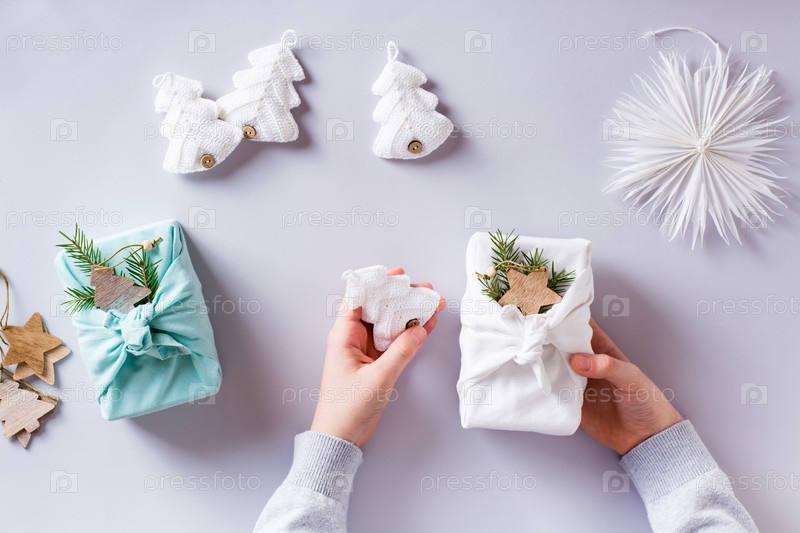 Детские руки держат фурошик и вязаную елочку. Экологичные подарки. Вид сверху