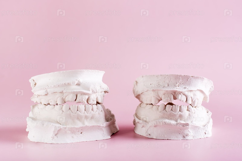 Два гипсовых слепка кривых детских зубов на розовом фоне. Стоматология и ортодонтия