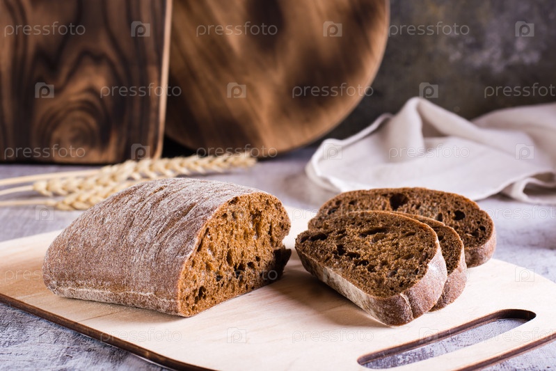 Нарезанная ржаная чиабатта на разделочной доске на столе. Домашняя выпечка