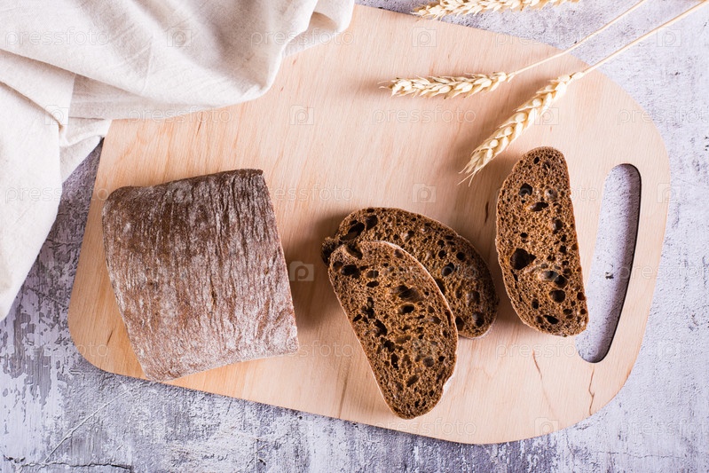 Итальянский ржаной хлеб чиабатта, нарезанный на деревянной доске на столе. Вид сверху