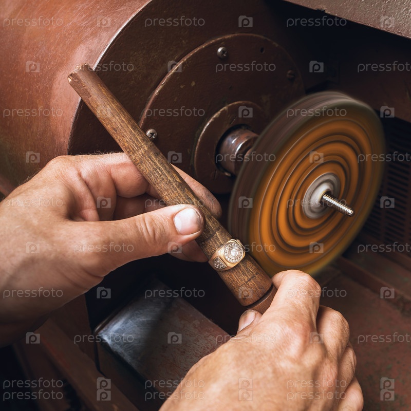 Ювелир полирует золотое кольцо на станке в мастерской