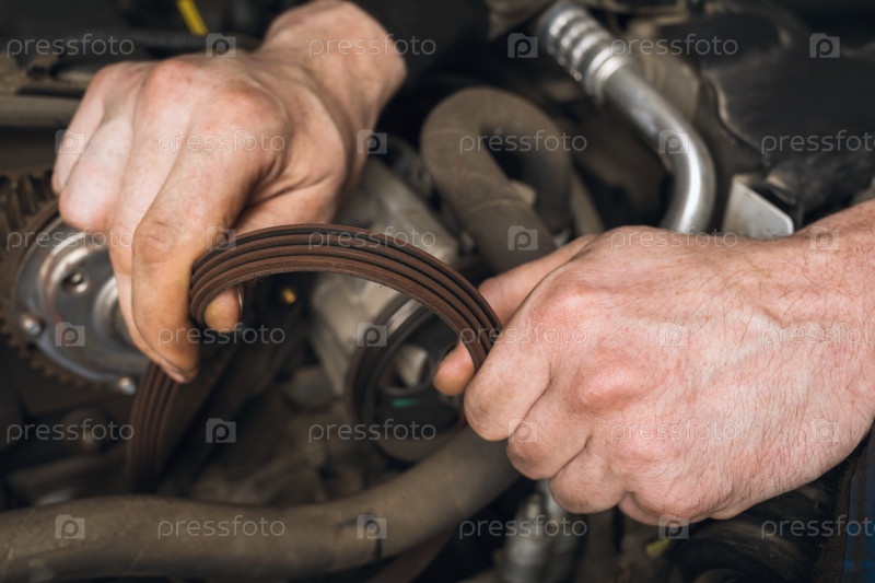Автомеханик проверяет состояние ремня генератора во время технического осмотра