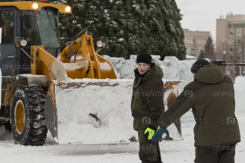 Рабочие лопаты убирают снег в ледяном городке