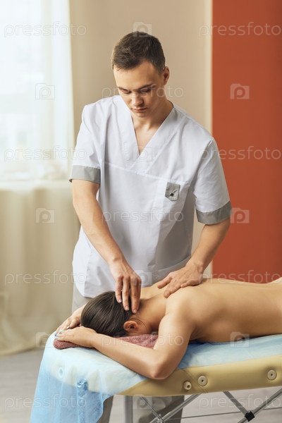 Мануальный терапевт массирует шейный отдел позвоночника клиенту в его кабинете