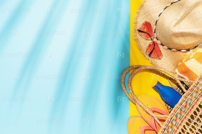 Соломенная шляпа, солнцезащитные очки и другие пляжные аксессуары на цветном фоне с копией пространства