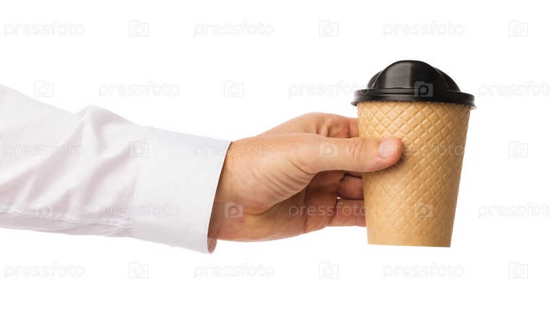 Рука держит бумажную чашку кофе на белом фоне, шаблон для дизайнеров