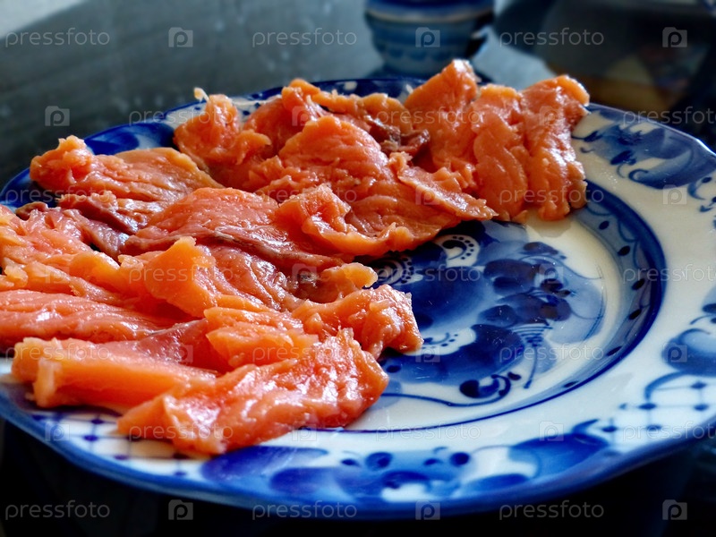 Кусочки малосольной семги на праздничном столе. Натуральная еда, закуска. Домашняя закуска под рюмку водки. Посуда в стиле русской классической Гжели. Гжель — русский народный промысел керамики и производства фарфора и разновидность русской народной роспи